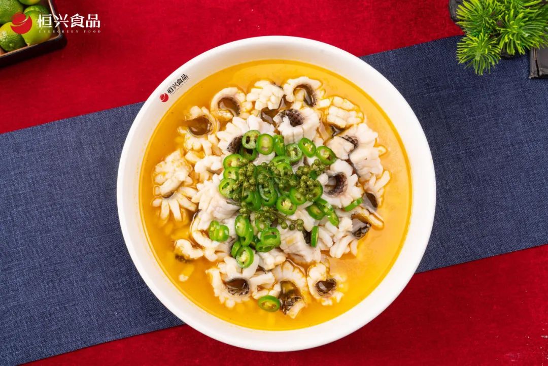 同时,恒兴水产食品事业部市场经理莫威向大家介绍了工厂最新的产品及对比优势,莫总表示恒兴一方面致力提升黑鱼产品的口感、鱼片形态和肉质Q弹程度;另一方面还完善了适用多场景的黑鱼应用产品体系。如标配应季火锅的火锅大刀鱼片,鱼片片型大且完整,少浆的鱼片色泽更红润有光泽,涮煮后口感更紧实富有弹性,非常适合火锅店摆盘出品。在外形的改良创新上,免浆黑鱼花熟化后自然打卷,像一朵朵盛开的花,精致感直面客户需求。
